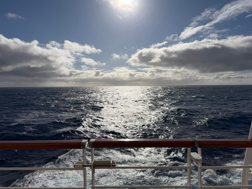 Sea life was fairly constant throughout the day. As soon as we were offshore the clouds and sun were more consistent. Instead of small spots of sunshine there were large spots of sunshine. When I walked the promenade this afternoon (four miles) there were some wet snowflakes; the temperature had dropped to 42 degrees Fahrenheit or about 5 degrees Celsius. Winds were over 30 knots; the ship has been leaning slightly much of the day and swaying a bit, but nothing too horrible and not as bad as the Bay of Biscuits.
