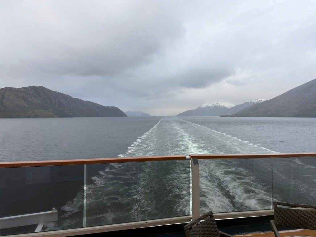 Anyway, the first thing I tend to do in the morning is look outside off the stern of the ship. If it isn’t raining I hop out there and snap a photo. Beautiful, isn’t it? Then I sit at my desk here and write a little and sip coffee.