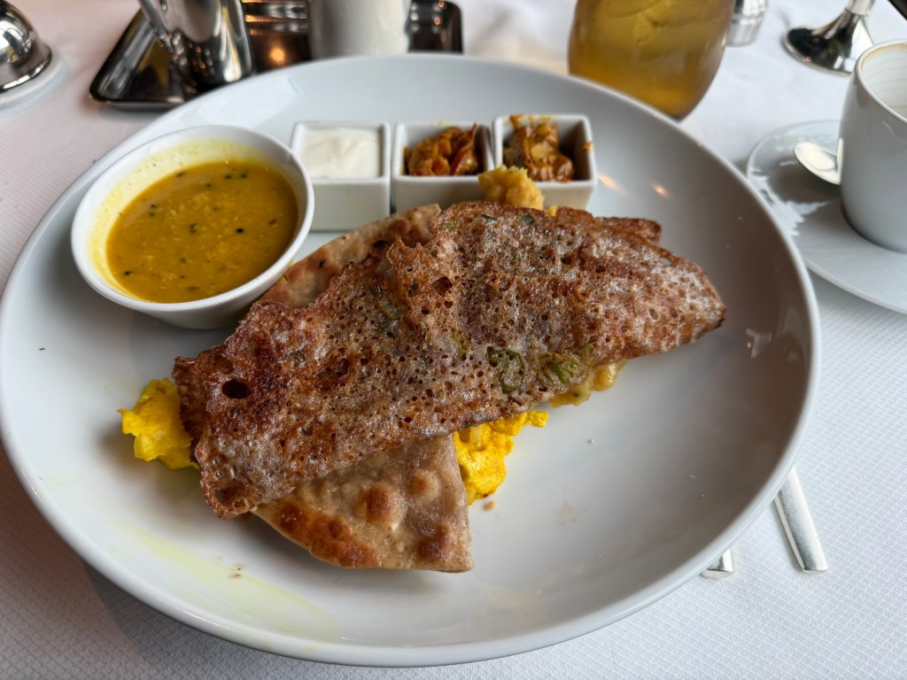 The Pinnacle Grill menu is obviously more substantial than the MDR menu. On this particular day I had the aloo masala (potato curry I think) and egg burjhi (eggs with peppers and spices I think). It was served with a dosa (lentil crepe), chapati bread, stewed lentils, and some chutneys.