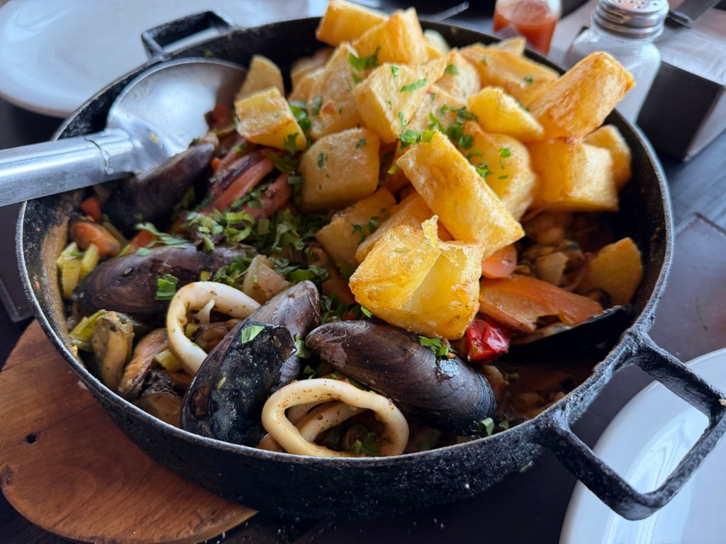 It was so good.  Mussels and baby octopus and shrimp and calamari stewed in white wine-tomato broth with nicely roasted and fried potatoes.